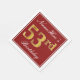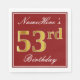 This simple and elegant paper napkin design features a message like "NameHere’s 53rd Birthday" (with the "53rd" having a faux gold-like colouring) within a red-coloured square area featuring a simple border outline. The name is in a white-coloured script-like text, and can be customised. Napkins like these could perhaps be used at a birthday party for somebody who is celebrating their fifty third birthday. [~Z0000138]
