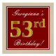 This simple and elegant birthday party poster design features a personalised message like "Georgiana’s 53rd Birthday!" (with the "53rd" having a faux/imitation gold-like colouring look) within a red-coloured square area featuring a simple border outline. The name is in an elegant white-coloured script-like text, and can be customised. A personalised birthday party poster like this could perhaps be used as a decoration at a party being held for somebody who is celebrating their fifty third birthday. [~Z0000234]