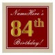 This simple and elegant birthday party poster design features a personalised message like "NameHere’s 84th Birthday!" (with the "84th" having a faux/imitation gold-like colouring look) within a red-coloured square area featuring a simple border outline. The name is in an elegant white-coloured script-like text, and can be personalised. A personalised birthday party poster like this could perhaps be used as a decoration at a party being held for somebody who is celebrating their eighty fourth birthday. [~Z0000234]