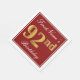 This simple and elegant paper napkin design features a message like "FirstName’s 92nd Birthday" (with the "92nd" having a faux gold-like colouring) within a red-coloured square area featuring a simple border outline. The name is in a white-coloured script-like text, and can be personalised. Napkins like these could perhaps be used at a birthday party for somebody who is celebrating their ninety second birthday. [~Z0000138]