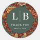 This elegant wedding sticker features a rich floral design with peonies and chrysanthemums in warm shades of pink, orange, and yellow, set against a deep red background. The composition includes green foliage and two birds at the bottom center, creating a harmonious balance reminiscent of East Asian motifs. At the heart is a dark green circle with bold serif typography that reads "L | B" and "THANK YOU," conveying gratitude and celebration. The overall style exudes sophistication and tradition, making it perfect for commemorating special moments with a timeless aesthetic.