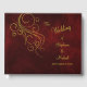 This wedding guest book is embellished with an elegant gold swirl on the front, with the bride and groom first names in gold on a burgundy red gradient background. All of the text fields may be easily changed. The back of the book has the same gradient red background, but without the swirl or the text.
