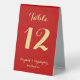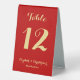 Create your own custom, personalised, modern, elegant, stylish, simple, minimalist, classy, stylish, chic, beautiful faux gold typography script on red background, faux gold hearts, white plastic polystyrene, table number tent sign, featuring the bride & groom's names and the wedding date. To customise, simply type in the table number, the couple's name (bride & groom / husband & wife), and the wedding / marriage anniversary date. While you personalise, you'll be able to see a preview throughout. Perfect for wedding, bridal shower, anniversary celebrations, dinner party, or other special occasion, for wedding planners, event managers, venue management companies, restaurant, cafe, hotels, resorts, hospitality industry, convention centres, small business, and more.