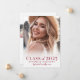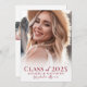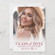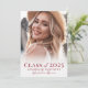 A simple and elegant boho-inspired graduation announcement with a light and bright aesthetic. The front features a full-page photo with a soft white gradient at the bottom, beautifully framing the text. "Class of 2025" appears in bold red fonts, followed by the graduate's name and school in elegant handwritten script for a timeless touch.