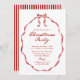 Host your holiday celebration in style with this elegant Christmas party invitation featuring a hand-drawn red ribbon frame with a bow at the top. “Christmas Party” is displayed in a graceful red calligraphy script with your party details below. The classic red-and-white color palette and vintage-inspired lettering create a timeless design, complemented by a striped pattern on the back. Perfect for both casual gatherings and formal Christmas soirées.