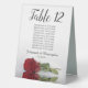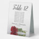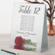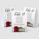 These tent table number signs are not only beautiful, they even include a list of names for the guests at each table, making it easy for your guests to find their seat at your wedding reception. The design is both elegant and romantic featuring a single red rose lying on its side reflecting in water with waves and ripples. The title is in lacy script calligraphy with bold numbers so your guests can easily find the right table. There is room for the names of the couple and the wedding date.