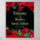 Pretty birthday welcome sign with red roses flowers and green foliage. The words can be changed to suit your own details or requirements. Would be perfect for a sweet sixteen birthday party.
