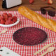 Beautiful red paper plate with an abstract textured digital painting of whimsical glowing red swirls.