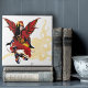 A striking Victorian steampunk fairy dressed in bold crimson and gold, poised with confidence and intricate detail. Her vibrant wings and refined period-inspired outfit create a powerful fusion of elegance and fantasy. In behind her is a softly rendered, light yellow ghostlike octopus—its curling tentacles weaving through the composition like an ornamental echo. This subtle yet captivating element adds a layer of surreal mystery, mirroring the deeper themes of imagination, the sea, and hidden worlds of steampunk storytelling.
