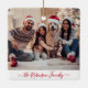 Modern Simple Elegant Calligraphy Red and White 3 Photo Collage Merry Christmas Script Ceramic Ornament. This festive, minimalist, whimsical three photo holiday Ornament features a pretty grid photo collage and says „Merry Christmas”! The „Merry Christmas” text is written in a hand lettered swirly swash-tail font script in red on white colour background. On the reverse side one full photo with family name. Pretty keepsake for your family and friends in Christmas Holiday season.
