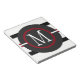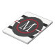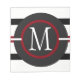This elegant and sleek design is composed of two black bars top and bottom, a red bar in the middle with a white line on either side, and a customisable white monogram on a black circle background with a red border.