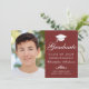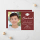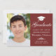 Send your family and friends a unique personalised photo graduation card featuring your custom photo on the left and to the right a white grad cap with the word "Graduate", class/year, name and other ceremony details in formal white script calligraphy to personalise on a red maroon background. Designed by ©Susan Coffey.