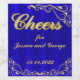 "Cheers" wedding wedding bottle tag. Royal blue background, gold text and decor.