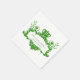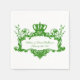 Paper disposable napkins perfect for the wedding reception, couple's shower, or rehearsal dinner, features a green print regal design of scrolls, leaves, and royal crown with an area you can add the bride and groom's names and wedding date, all on a white background.