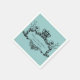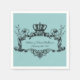 Paper disposable napkins perfect for the wedding reception, couple's shower, or rehearsal dinner, features a regal design of scrolls, leaves, and royal crown with an area you can add the bride and groom's names and wedding date, all on a blue background.