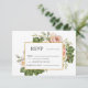 This elegant wedding RSVP card features a gold frame with a watercolor rose and greenery branch as a template background. The words invitation words are written in black font on a white background.