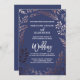 This elegant rose gold and navy leafy frame wedding invitation card is perfect for a classy wedding. The design features a stunning blush pink leafy frame on a dark blue background and is paired with a dazzling cursive font.