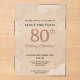 Celebrate a milestone 80th birthday with this elegant invitation. Featuring delicate botanical illustrations in rose gold and blush tones, set against a soft cream background, subtle gold glitter accents add a touch of sparkle. This customizable design offers a sophisticated and warm way to invite guests to a special celebration for your loved one. Perfect for a memorable 80th birthday party it captures the joy and grace of reaching this remarkable age. Easily personalize all event details for a truly unique celebration.