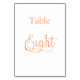 The table number is written with an elegant hand lettered style script. Rose gold letters, white background. This table number is also available in black.