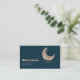 An elegant crescent moon pattern business card. The design features a rose gold celestial moon and text on a navy blue background. This card would be perfect for a female business, especially one involved in healing arts such as yoga or meditation.