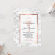 Invite your guests to help you celebrate your special day with this elegant invitation featuring modern script, rose gold copper and charcoal grey text including an artistic palm tree and metallic rose gold copper frame on the front. A white and grey marble background adorn the front and back of the card.