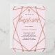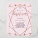 These stylish baptism invitations feature a rose gold foil geometric pattern on a blush pink background, with elegant modern typography and a rose gold foil cross.