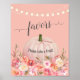 Enjoy this elegant, autumn, floral baby shower for a baby girl. Pinks, corals, and yellow florals with a blush pink background. "Favours" above pumpkin and "Please take a Treat!" on pumpkin. String lights at top and pink ribbon wrapped around pumpkin stem.