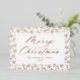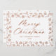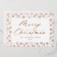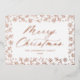 Elegant holiday card with "Merry Christmas" displayed in a rose gold foil calligraphy script with a rose gold foil snowflake and pine branch border on a white background. Personalise the front of the non-photo holiday card by adding your name and the year. The back of the modern holiday card features your custom message with a beautiful snowflake pattern.