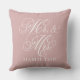 Elegant square accent pillow for happy couples and newlyweds features a white script Mr. and Mrs. design with custom monogram text that can be personalised with the married last name. The mauve / rose pink background colour can be customised to coordinate with your home or bedroom decor colours.