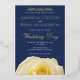 Elegant Yellow Rose Gold Ornament Navy Blue Wedding Gold Foil Invitation. Modern and elegant yellow rose, gold foil pressed ornament and text on a dark navy blue background.
