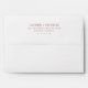 This wedding envelope design features a minimalist layout with centred text on a plain white background, creating an elegant and uncluttered appearance. The colour palette includes a muted rose pink hue that contrasts gently against the stark backdrop, enhancing readability while maintaining a subtle aesthetic. Utilising digital typography with clean lines and precise letterforms in a serif font, this modern and understated style emphasises clarity and sophistication. The generous spacing and orderly arrangement of text convey a mood of refined simplicity and calmness, making it perfect for couples seeking a contemporary yet formal look for their special day.