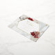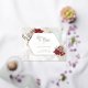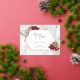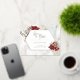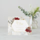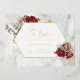 Elegant artistic red, white and tan roses, ferns, eucalyptus and greenery with custom gold foil Save the Date script on hexagon shaped label edged in gold foil with editable text fields on white marble background with gold veins. Back features complementary graphics and additional text fields.