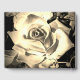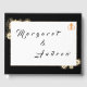 Design features an elegant black background with sepia roses surrounding a white rectangle displaying text. Names of Couple are displayed in an elegant font on front. A golden cross intertwined with two wedding rings is featured in top right corner. Gorgeous design is very pleasing to the eye. Back displays a large image of a beautiful sepia rose against a black background.