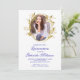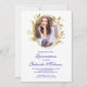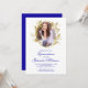 Elegant quinceanera invitation, personalised with your photo. Simple, clean and fresh design in royal blue and gold and white with fancy script typography. Your picture is displayed in portrait format with a gold geometric oval frame with botanical gold leaf design. The back of the invitation is royal blue with gold floral line art.