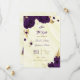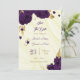 elegant romantic royal purple flowers and gold leaves against marble background save the date invitation