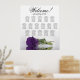 This modern floral wedding seating chart boasts 16 tables with a romantic design featuring a stunning deep royal purple rose lying on its side, reflecting in a water pool. The title, "Welcome! Please Find Your Table," is elegantly written in script calligraphy lettering, and there is ample space at the bottom for the couple's names and wedding date. The chart accommodates 160 guests, with 10 seats assigned to each table, adding elegance, class, and style to your wedding reception while enabling guests to find their seats conveniently.