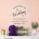 Welcome your wedding guests with this beautiful acrylic sign. The romantic design features a single long stemmed deep royal purple coloured rose lying on its side mirrored in a pool of water. The elegant script calligraphy title includes lacy swashes or flourishes on the ends of the letters, and the names of the couple and wedding date appear below.
