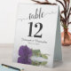 These tent signs will not only help your guests find their tables, they'll also make your wedding reception more beautiful. The design is both elegant and romantic featuring a single royal purple coloured rose lying on its side reflecting in water with waves and ripples. The title is in lacy script calligraphy with bold numbers so your guests can easily find the right table. There is room for the names of the couple and the wedding date.