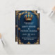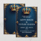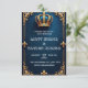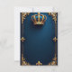 Elegant royal-style wedding invitation template featuring a intricately designed golden crown adorned with precious gems at the top, set against a rich dark blue background with subtle textures resembling velvet, surrounded by ornate castle-inspired motifs such as towers, arches, and fleur-de-lis in gold filigree, with a touch of creamy white accents to evoke luxury and sophistication, with ample space for personalised wedding details in a refined, serif font with subtle gold outline, and a subtle golden border to complete the regal look, perfect for a majestic and opulent wedding celebration.