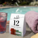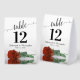 These tent signs will not only help your guests find their tables, they'll also make your wedding reception more beautiful. The design is both elegant and romantic featuring a single rust orange or burnt umber coloured rose lying on its side reflecting in water with waves and ripples. The title is in lacy script calligraphy with bold numbers so your guests can easily find the right table. There is room for the names of the couple and the wedding date.