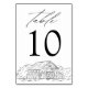 Rustic barn table number cards featuring a sketched illustration of a barn and forest at the bottom of the design with a white background. "Table" is displayed in elegant black calligraphy with the table number shown below. Design repeats on reverse side. To order the table cards, simply add each number to your cart individually and check out when you're finished. Designed to coordinate with our Elegant Rustic Barn wedding collection.
