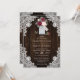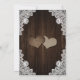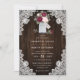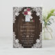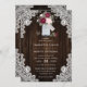 Rustic burgundy and blush floral wedding invitation featuring roses and baby's breath flowers inside a mason jar against a barn wood background adorned with white floral lace and string lights. Perfect card design for inviting your guests to your burgundy and blush rustic wedding party.