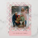 This holiday card stands out with its elegant and unique design. It features a timeless "Happy Holidays" greeting printed in real rose gold foil, customisable to your preference, on a light green, pink, and dark red plaid pattern design. The front offers space for your family name, photo, and a custom seasonal greeting, while the back is ideal for adding a personalised seasonal message or poem. It's a stylish way to send your holiday wishes.