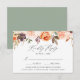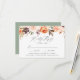 Enhance your wedding stationery with our Elegant Autumn Floral Wedding RSVP Cards. Featuring a top border of hand-painted watercolor flowers, succulents, and leaves in a warm autumn palette of blush pink, peach, orange, cream, brown, and green, these RSVP cards beautifully complement your fall wedding theme. Customise them with your desired RSVP date, personalised accepts/declines wording, and optional dinner choices for a seamless guest experience. The reverse side showcases a solid green background, adding a modern touch of contrast to the design. Perfect for couples seeking a blend of rustic charm and elegance, these RSVP cards are a stylish addition to your wedding suite.