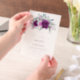 These invitations blend rustic charm with modern elegance, perfect for a sophisticated yet natural wedding celebration. The design features a beautiful palette of deep purple and soft blush tones and a striking geometric diamond shape that adds a contemporary touch. The delicate floral accents, combined with the unique vellum overlay, create a layered, ethereal look. Perfect for couples seeking a unique invitation that balances rustic warmth with modern design and luxurious details.