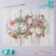 Trendy french artwork in rustic wood background with filigree lace, birds and so on.