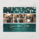 Personalised teal and gold wedding photo save the date postcards with an elegant script font. Our wedding save the date features a photo collage of 3 images against a rustic teal wood background adorned with string lights. Easily personalise this rustic photo save the date postcard with your images and wedding details including a wedding website, if desired. For custom requests, please send us a message.