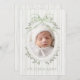 Soft sage green and white stripe background with a fancy vintage frame was used to create this lovely announcement. Add your beautiful boy or girl photo in the vintage faux frame. Perfect for a girl or boy baby birth announcement.