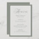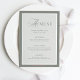 These elegant, luxe wedding menu cards feature a sage green border and a lighter sage green and white design. There is a mix of classic text and modern calligraphy for a classy and minimalist design perfect for your timeless, formal wedding.