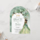 Elegant and classy sage green with gold-tone accents floral bough combined with an arched white and gold-tone panel on a clear background "Sweet 16" party design. Features a dark brown to black-haired brunette brown-skinned beauty in a flowing sage-coloured ball gown. Composite design by Holiday Hearts Designs.
